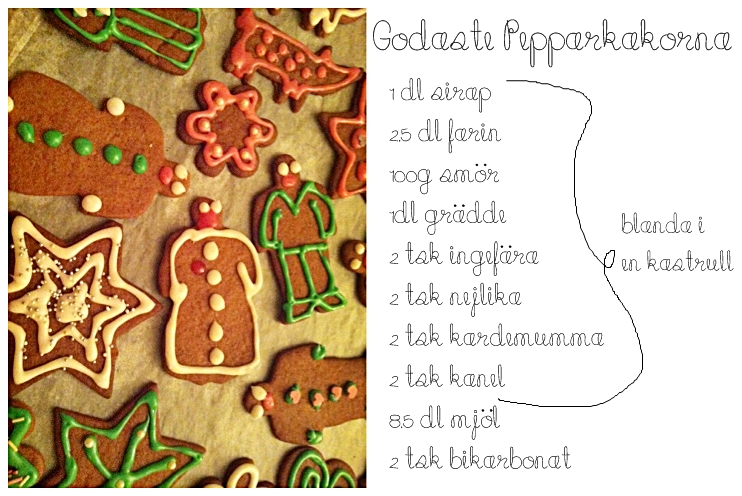 Förra söndagen bakade jag och Grannen pepparkakor. Kvällen innan hade jag lagat en hemlagad pepparkaksdeg. Frysdegen man får från butiken är nog riktigt god och bra den med, men jag tycker liksom det hör till att man skall laga egen pepparkaksdeg. Det är dock inte alltid degen blir så lyckad. Ibland blir den smaklös, ibland för hård och ibland för lös. Personligen tycker jag absolut inte om pepparkaksdegar med ägg eller pomerans. Nej, traditionella pepparkakskryddor, grädde, farin och sirap skall det vara. Årets version blev särskilt lyckad. Jag modifierade lite detta recept, samt det recept som finns i Sju sorters kakor-boken. Snåla inte med kryddorna, då blir det godast! Lämna lite av mjölet till utbaket, en halv dl ungefär. Degen kommer kännas hård när du tar ut den ur kylen, men efter lite kavlande och bearbetande så blir den mjuk och bra. Degen räcker till ca. 4 plåtar pepparkakor dvs. ca 80st.